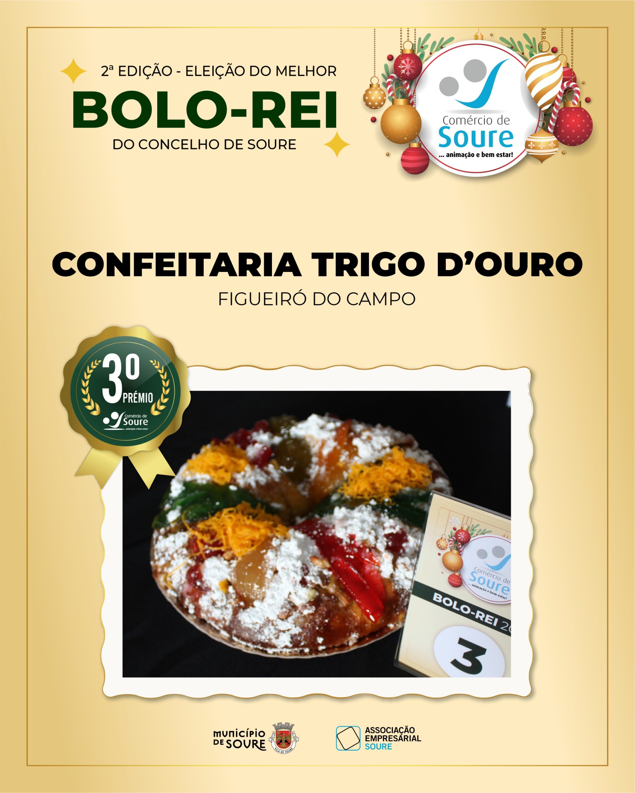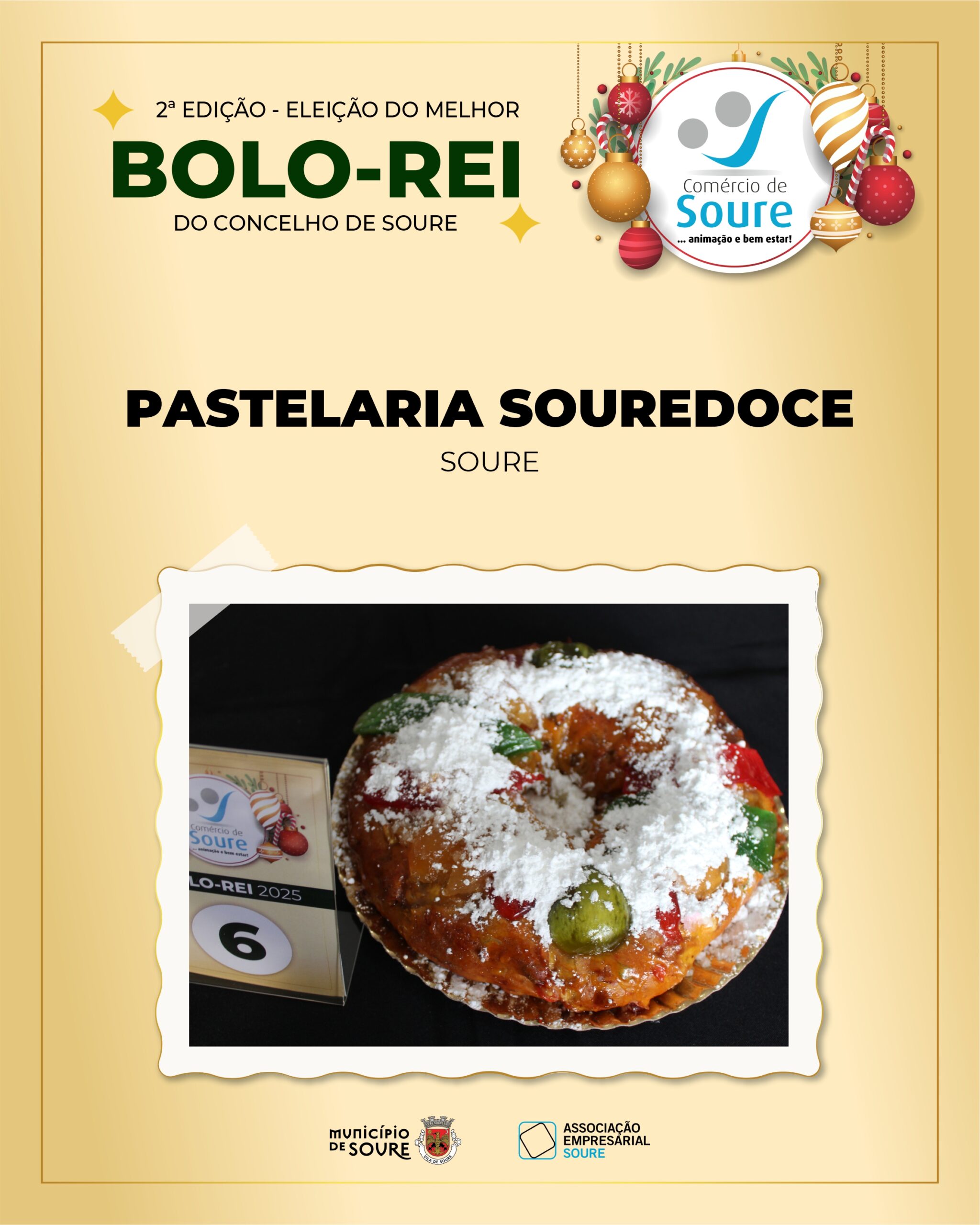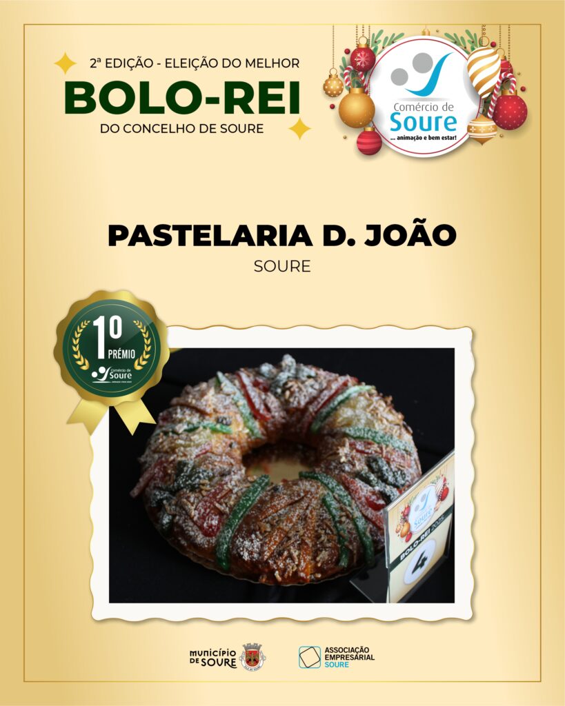A Associação Empresarial de Soure (AESOURE), com o apoio da Câmara Municipal de Soure, promoveu no dia 8 de dezembro de 2025 a 2.ª Edição – Eleição do Melhor Bolo-Rei do Concelho de Soure. A iniciativa decorreu no Átrio do Edifício dos Paços do Concelho e contou com a participação de um total de seis estabelecimentos locais dedicados à panificação.